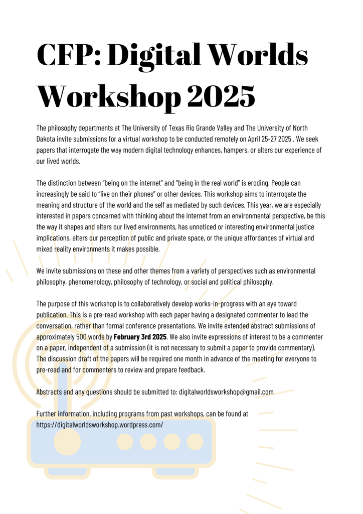 Ian Werkheiser is an Associate Professor in the Department of Philosophy at University of Texas Rio Grande Valley. He is also the host of Thought About Food, a podcast on food and food studies and Digital Worlds, a podcast on the philosophy of technology. His research is currently focused on the interaction between emerging technology on the one hand and communities’ responses to environmental problems (particularly around food systems) on the other. This work brings in philosophy of the environment, philosophy of technology, bioethics, social and political philosophy, and more. Recently, he has been applying tools from environmental philosophy and especially environmental justice to emerging digital technology, and has started the Digital Worlds Workshop to examine issues in emerging technology and virtual worlds. Digitally altered environments, more than the technology itself, are what most people experience and interact with, and these new augmented environments have a host of philosophical implications. View more posts